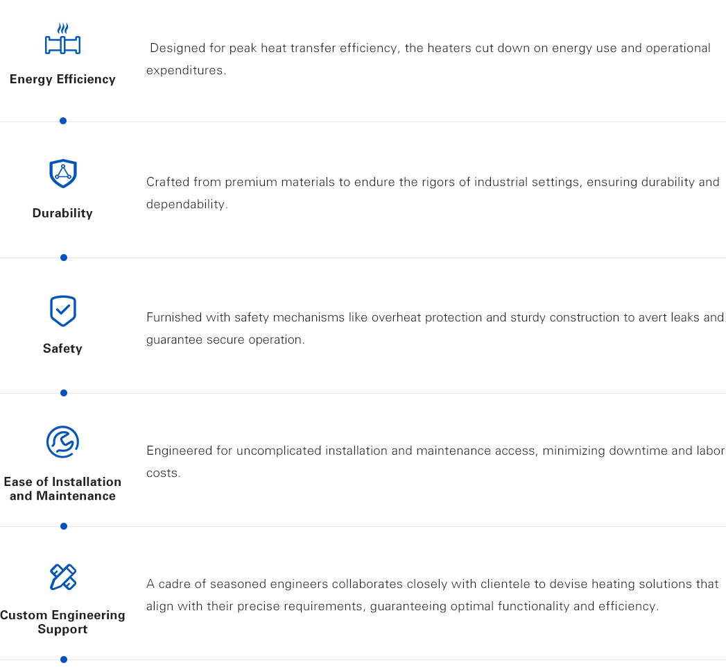 · Fiabilité: Garantir la robustesse et la longévité des systèmes de chauffage, indispensables au maintien de processus industriels ininterrompus. Assistance technique : fourniture d'une assistance et de ressources exhaustives, telles que des bibliothèques techniques, des dessins CAO et des outils d'ingénierie, pour faciliter la formulation et l'exécution de solutions de chauffage efficaces.